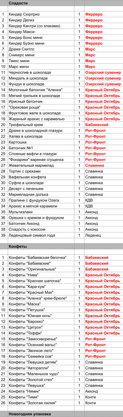 Драже в шоколадной глазури (1 шт), Халва в шоколаде (1 шт), Картошка (1 шт), Батончик №1 (1 шт), Слоеные вафли в глазури (1 шт), "Фонарики" вареная сгущенка (1 шт), Конфеты "Замоскворечье" (1 шт), Конфеты "Осенний вальс" (1 шт), Конфеты "Звонкое лето" (1 шт), Конфеты "Семейка сов" (1 шт)